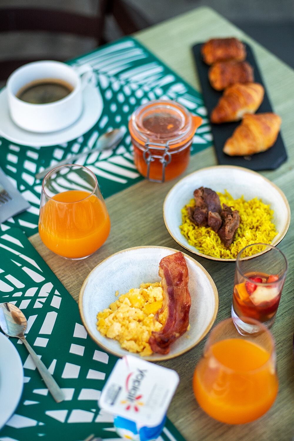 Salty side : Cheese and charcuterie platters, heated rice, scrambled eggs and bacon, roasted potatoes